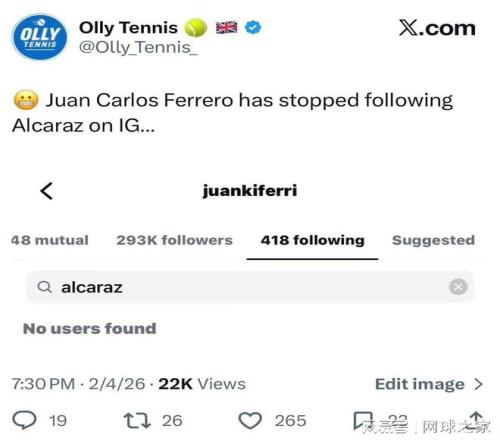 昨天,有网友注意到费雷罗已在Instagram上取关了他曾经的爱徒阿尔卡拉斯,这对备受瞩目的师徒彻底分道扬镳,走向了故事里最令人唏嘘的章节。它不再仅仅是网球圈内一则寻常的流动新闻,而是一场被置于聚光灯下的、体面与拉扯交织的漫长告别。职业网坛教练与球员间的聚散离合本如季节更替般寻常,但只因主角是那个来自穆尔西亚、被费雷罗亲手从璞玉雕琢成王者的阿尔卡拉斯,一切便有了不同的重量。如今,阿卡在墨尔本公园捧起澳网冠军奖杯,完成了全满贯的伟业,脸上的笑容是灿烂的。而他的成长之路上,那个最熟悉的身影已不在场边。这辉煌的胜利,被许多人解读为一个无声的“独立宣言”,背后却是一个关乎成长、权力与最终和解的复杂叙事。